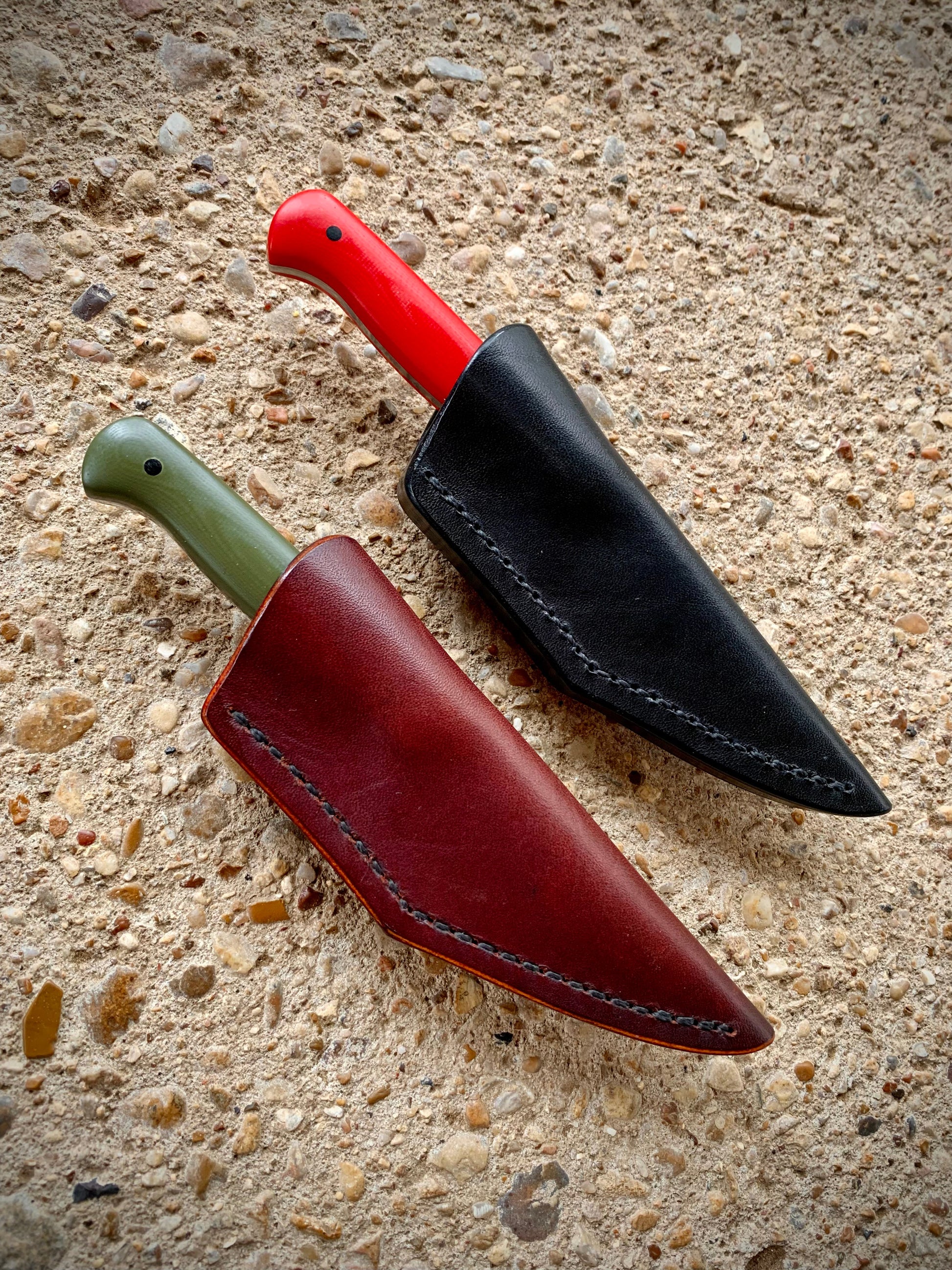 A quality handmade, wet formed leather sheath with a steel belt/pocket clip.